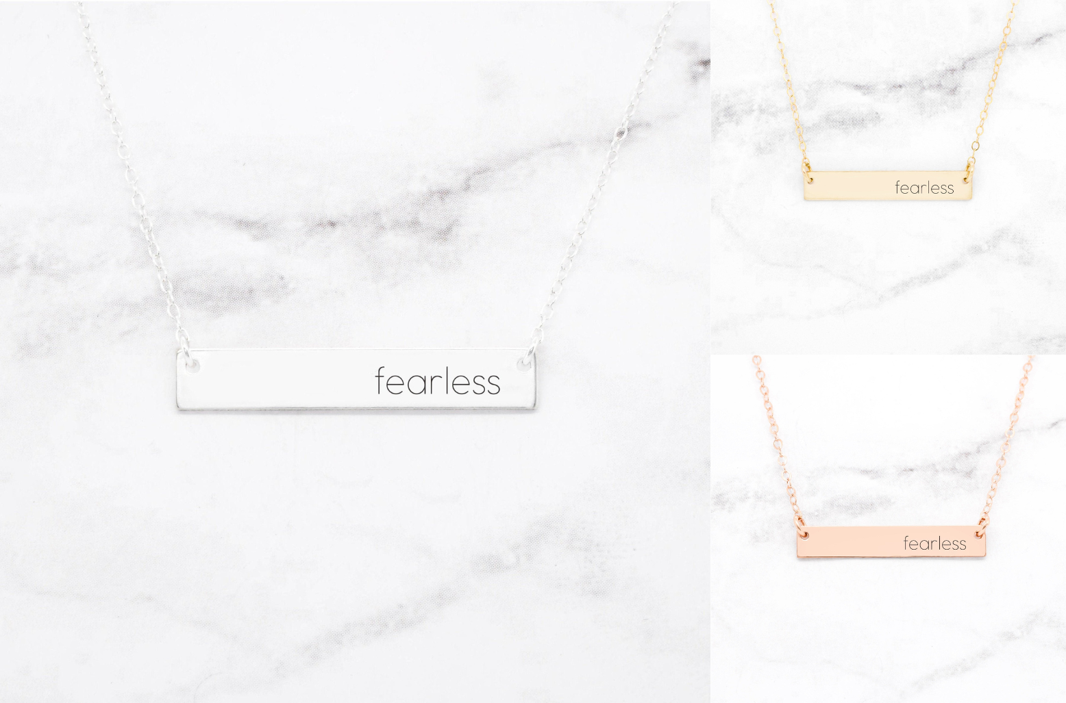 Crafted from high-quality sterling silver, the Fearless Bar Necklace offers a minimalist yet bold design that complements any outfit. Its sleek bar pendant symbolizes strength and confidence, making it a perfect accessory for daily wear or meaningful gifting. The letters on this necklace are precision laser engraved in a lowercase font. Durable and hypoallergenic, this 18" necklace ensures lasting comfort and style. Elevate your jewelry collection with a piece that embodies fearless elegance.