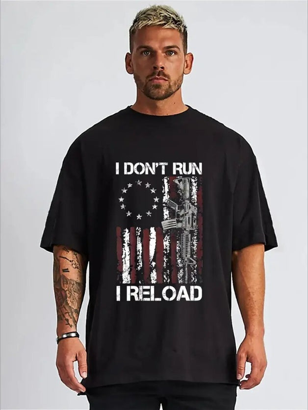 This premium Men's I Don't Run I Reload T-Shirt features a bold statement with the American flag across the chest. Crafted with a comfortable round neck and short sleeves, it combines durability with everyday wearability. Perfect for firearm enthusiasts, range days, or casual outings where you want to make a statement with your apparel.