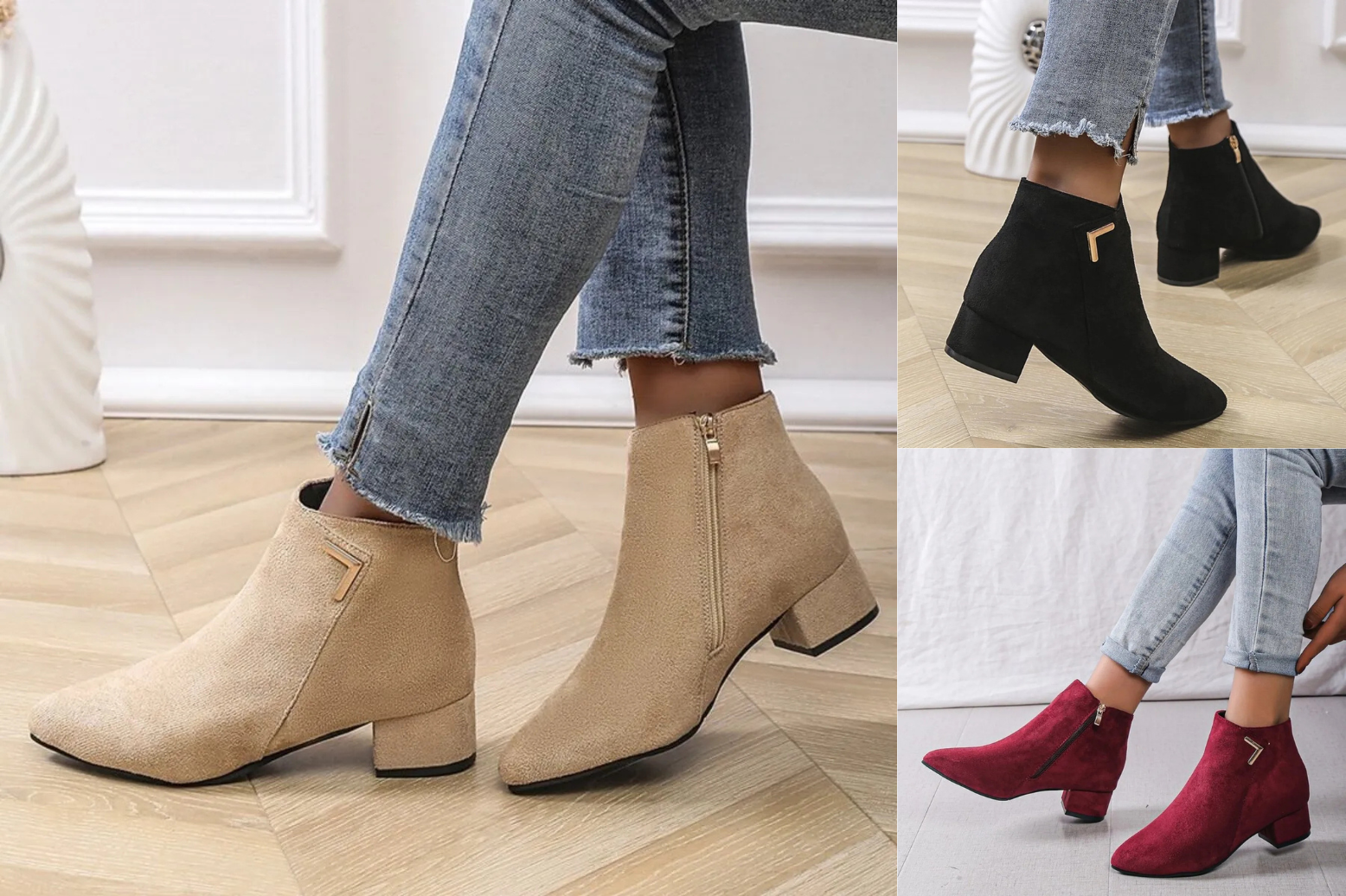 These women's suede zipper booties combine sleek, pointed toes with a sturdy block heel for a sophisticated yet comfortable fit. Crafted from soft suede, they offer durability and a refined texture that elevates any outfit. The convenient side zipper ensures easy on and off, making them an ideal choice for both everyday wear and special occasions. Perfect for adding a touch of elegance to your wardrobe while maintaining practicality.